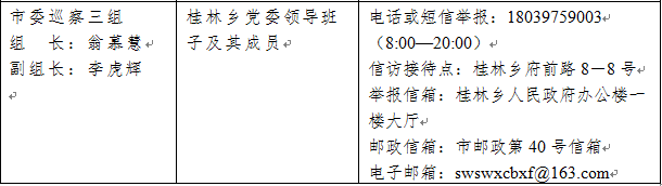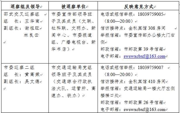 本網訊 根據市委的統一部署,市委第五輪第一批巡察工作于2018年3月7日正式啟動,三個巡察組將于2018年3月8日至4月7日分別進駐市市委宣傳部、交通運輸局、桂林鄉開展巡察。現將有關事項公告如下: 一、巡察內容 重點了解巡察對象是否存在黨的領導弱化、黨的建設缺失、全面從嚴治黨不力等問題,了解意識形態工作責任制落實情況以及扶貧領域存在的問題,是否存在違反政治紀律和政治規矩,違反廉潔紀律、組織紀律、群眾紀律、工作紀律、生活紀律等方面的情況。重點查糾“四風”情況以及遵守中央八項規定精神等方面的問題。堅決整治侵害群眾利益的不正之風和腐敗問題。了解省委巡視反饋意見和省委、南平市委、邵武市委全面從嚴治黨主體責任檢查反饋問題整改以及辦理移交事項中存在的問題,市委要求了解的其他情況。 二、反映問題的渠道 巡察期間,市委各巡察組設立信訪接待點、舉報電話、舉報箱,接受群眾來訪、來電、來信。巡察組及領導 被巡察單位 反映意見方式邵武交叉巡察組 組 長:王華南副組長:謝祖旺
