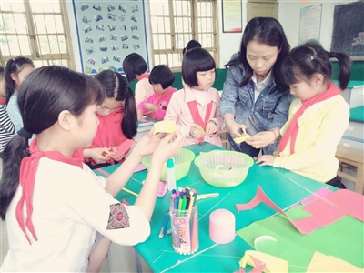 本網訊?? 5月11日,大埠崗中心小學開展“媽媽,我愛您!”母親節主題活動。圖為孩子們在老師的指導下,親手為媽媽制作手工花藝。(大埠崗)