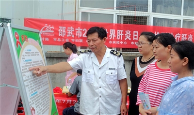 ??? 本網訊?? 7月25日,市衛計局、市總工會、市婦聯等單位工作人員到城郊工業園區,開展世界肝炎日主題宣傳活動。通過設立咨詢點、分發宣傳單、展示宣傳展板等方式,宣傳病毒性肝炎防治知識和國家相關政策。圖為工作人員講解宣傳展板上的相關內容。(徐陳清)