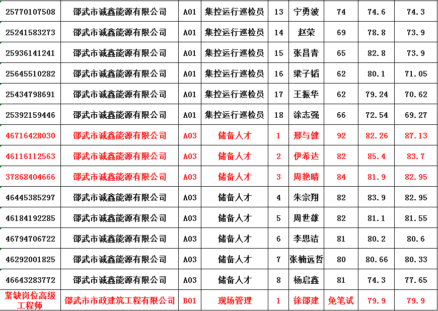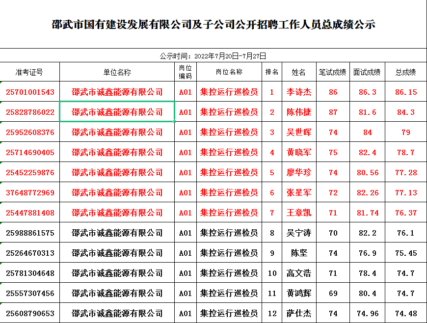 邵武市國有建設發展有限公司及子公司公開招聘工作人員總成績公示