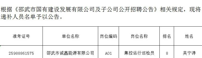 邵武市國有建設發展有限公司及子公司公開招聘工作人員遞補人員名單公示