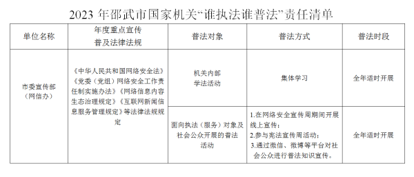 2023年中共邵武市委宣傳部(網信辦)“誰執法誰普法”責任清單