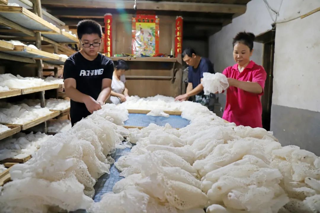 福建最大的種植基地,邵武竹蓀產量占全省的70%左右,種植面積1.5萬畝,年產值達2億元。 綠色產業高質量,鄉村振興底氣足。2022年,邵武食用菌、中藥材、水稻制種、茶葉等4大綠色產業實現產值10.7256億元,占農業總產值的17.67%。其中發展較快的中藥材實現產值1.0246億元,10年同比增長超20倍。 7月7日,種植30多畝,開采第10天,旺長第8天,雇工18名,已烤出干竹蓀230多公斤……在城郊鎮香鋪村租地種植竹蓀的梁建華,連續15年都有技術“高人”指導,年年高產高品質,收益不錯。