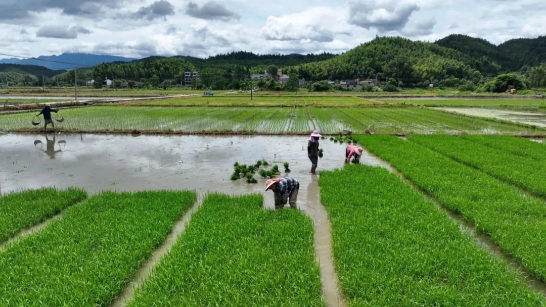 近日,邵武市肖家坊鎮坊前村鄧家坊組高標準農田里一派繁忙景象,農民們頭戴斗笠、腳穿雨靴,將一株株制種水稻秧苗整齊地移栽到田中,繪就了一幅令人賞心悅目的制種畫卷。