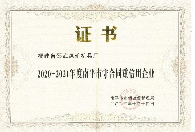 福建省邵武煤礦機具廠積極履行“守合同 重信用”市場主體責任。重視商業信譽和合同管理工作,建立了合同信用管理機制,設置合同信用管理機構和人員,合同檔案保存完整、齊全,能及時、準確地提供統計數據和有關資料。截至目前,該公司無重大失信行為。