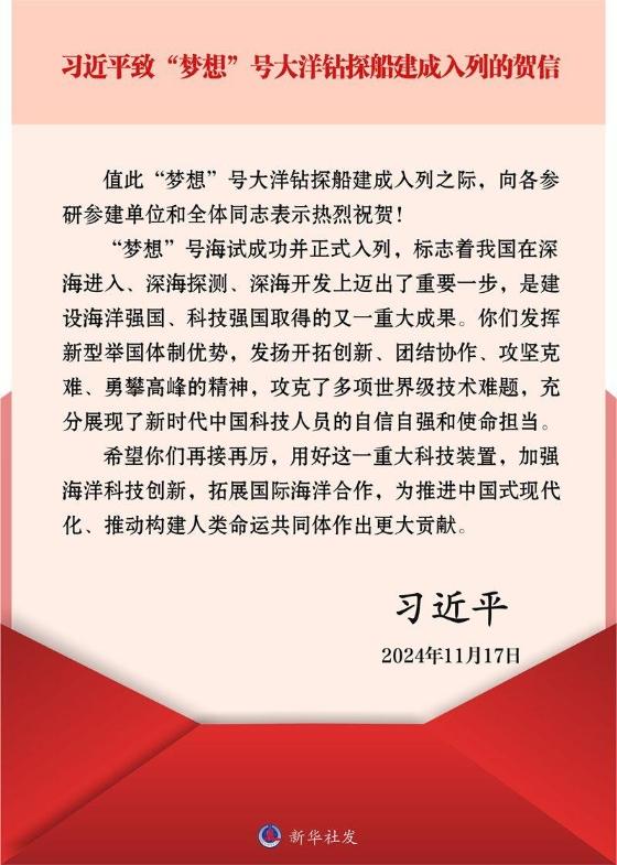 習(xí)近平致信祝賀“夢想”號大洋鉆探船建成入列強調(diào) 加強海洋科技創(chuàng)新拓展國際海洋合作 為推進(jìn)中國式現(xiàn)代化推動構(gòu)建人類命運共同體作出更大貢獻(xiàn) 新華社廣州11月17日電 我國自主設(shè)計建造的首艘大洋鉆探船“夢想”號17日在廣州正式入列。中共中央總書記、國家主席、中央軍委主席習(xí)近平發(fā)來賀信,表示熱烈祝賀。 習(xí)近平在賀信中指出,“夢想”號海試成功并正式入列,標(biāo)志著我國在深海進(jìn)入、深海探測、深海開發(fā)上邁出了重要一步,是建設(shè)海洋強國、科技強國取得的又一重大成果。你們發(fā)揮新型舉國體制優(yōu)勢,發(fā)揚開拓創(chuàng)新、團(tuán)結(jié)協(xié)作、攻堅克難、勇攀高峰的精神,攻克了多項世界級技術(shù)難題,充分展現(xiàn)了新時代中國科技人員的自信自強和使命擔(dān)當(dāng)。 習(xí)近平強調(diào),希望你們再接再厲,用好這一重大科技裝置,加強海洋科技創(chuàng)新,拓展國際海洋合作,為推進(jìn)中國式現(xiàn)代化、推動構(gòu)建人類命運共同體作出更大貢獻(xiàn)。 “夢想”號入列活動17日在廣州舉行。中共中央政治局委員、國務(wù)院副總理何立峰出席活動,宣讀習(xí)近平的賀信,宣布“夢想”號正式入列并講話。他指出,習(xí)近平總書記重要賀信為新時代新征程我國深海事業(yè)發(fā)展指明了前進(jìn)方向、提供了根本遵循。要深入學(xué)習(xí)領(lǐng)會、堅決貫徹落實重要賀信精神,加強“夢想”號運營管理,加快原創(chuàng)性、引領(lǐng)性科技攻關(guān),推動科技成果轉(zhuǎn)化,深化國際交流合作。要堅持和加強黨的全面領(lǐng)導(dǎo),認(rèn)真總結(jié)“夢想”號建設(shè)寶貴經(jīng)驗,發(fā)揮新型舉國體制優(yōu)勢,弘揚優(yōu)良作風(fēng),凝聚各方力量,持續(xù)推進(jìn)深海事業(yè)發(fā)展邁上新臺階。 “夢想”號大洋鉆探船總噸約33000,排水量42600噸,續(xù)航力15000海里,最大鉆深11000米,具備全球海域無限航區(qū)作業(yè)能力。