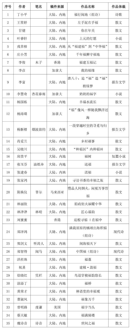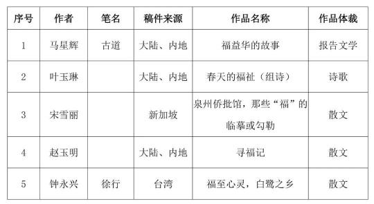 喜報 我市作家馬星輝作品《福益華的故事》 獲“中華福·福天下”全球華語征文活動一等獎 “中華福·福天下”全球華語征文活動評選結果通告 由福建省文學藝術界聯合會、福建省歸國華僑聯合會、福建省對外文化交流協會、福建省作家協會、學習強國福建學習平臺、福建文學雜志社、福建省文藝評論家協會聯合舉辦的“中華福·福天下”全球華語征文活動經過作品征集、評選、公示,并報省文聯黨組審批通過,最終評選出一等獎5篇,二等獎20篇,三等獎35篇,入圍獎39篇。現將結果公布如下: 一等獎 (5名,按姓氏筆畫排序)