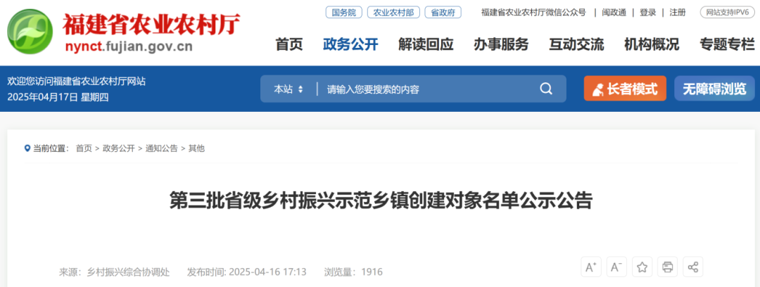 根據《全省鄉村振興示范鄉鎮、示范村創建工作方案》,福建省農業農村廳、鄉村振興局組織開展第三批省級鄉村振興示范鄉鎮創建對象申報推薦工作。經縣級申報、市級審核推薦、省級評審,擬將福清市海口鎮等40個申報鄉鎮納入第三批省級鄉村振興示范鄉鎮創建對象名單,現予公示。公示期為4月16日至4月22日。如有異議,請于公示期內實名向福建省農業農村廳反映。反映情況要實事求是,提供具體線索和證明材料。 聯系電話:0591-87865850 通信地址:福州市鼓樓區華林路123號1412室 郵政編碼:350003 福建省農業農村廳 2025年4月16日 第三批省級鄉村振興示范鄉鎮 創建對象名單 (共40個) 1.福州市福清市海口鎮 2.福州市長樂區鶴上鎮 3.福州市閩侯縣白沙鎮 4.福州市閩清縣雄江鎮 5.福州市永泰縣葛嶺鎮 6.廈門市集美區灌口鎮 7.漳州市華安縣仙都鎮 8.漳州市薌城區浦南鎮 9.漳州市長泰區巖溪鎮 10.漳州市漳浦縣石榴鎮 11.漳州市詔安縣四都鎮 12.泉州市惠安縣崇武鎮 13.泉州市南安市石井鎮 14.泉州市永春縣五里街鎮 15.泉州市石獅市靈秀鎮 16.泉州市洛江區馬甲鎮 17.泉州市德化縣國寶鄉 18.三明市三元區巖前鎮 19.三明市泰寧縣朱口鎮 20.三明市沙縣區富口鎮 21.三明市將樂縣南口鎮 22.三明市永安市青水畬族鄉 23.莆田市城廂區華亭鎮 24.莆田市仙游縣游洋鎮 25.南平市松溪縣鄭墩鎮 26.南平市政和縣石屯鎮 27.南平市武夷山市五夫鎮 28.南平市邵武市大埠崗鎮 29.南平市浦城縣九牧鎮 30.龍巖市連城縣朋口鎮 31.龍巖市漳平市南洋鎮 32.龍巖市新羅區白沙鎮 33.龍巖市永定區龍潭鎮 34.龍巖市長汀縣河田鎮 35.寧德市屏南縣熙嶺鄉 36.寧德市霞浦縣北壁鄉 37.寧德市周寧縣李墩鎮 38.寧德市福安市溪柄鎮 39.寧德市古田縣黃田鎮 40.平潭綜合實驗區君山鎮 來源:福建省農業農村廳網站 編輯:江桂煜 審核:繆順春 李婷 終審:陳一沿 |