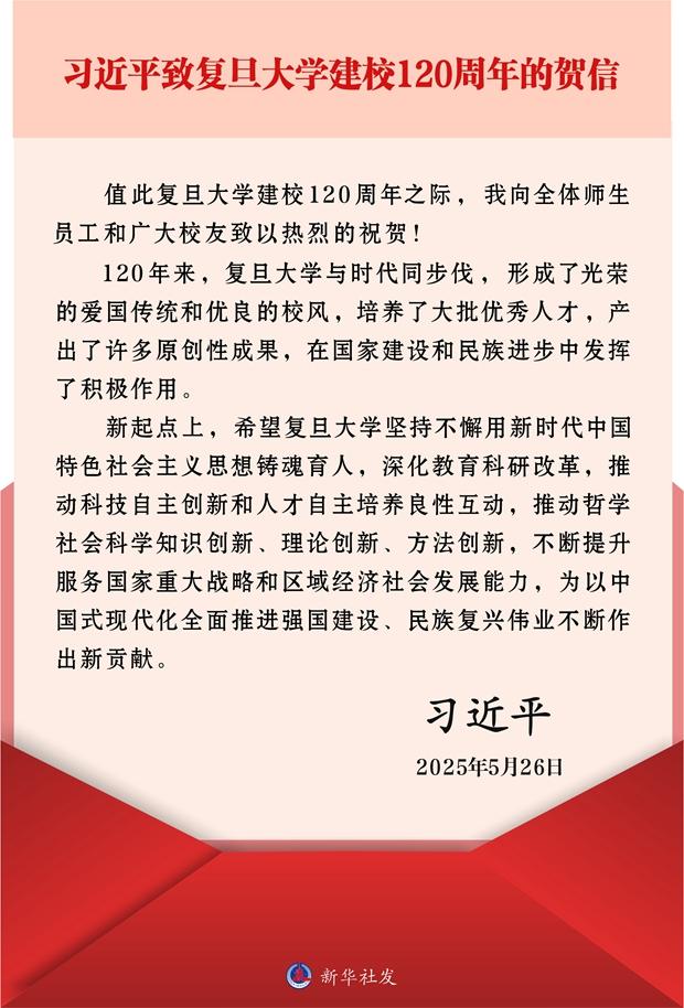 新華社北京5月26日電 習近平致復旦大學建校120周年的賀信 值此復旦大學建校120周年之際,我向全體師生員工和廣大校友致以熱烈的祝賀! 120年來,復旦大學與時代同步伐,形成了光榮的愛國傳統和優良的校風,培養了大批優秀人才,產出了許多原創性成果,在國家建設和民族進步中發揮了積極作用。 新起點上,希望復旦大學堅持不懈用新時代中國特色社會主義思想鑄魂育人,深化教育科研改革,推動科技自主創新和人才自主培養良性互動,推動哲學社會科學知識創新、理論創新、方法創新,不斷提升服務國家重大戰略和區域經濟社會發展能力,為以中國式現代化全面推進強國建設、民族復興偉業不斷作出新貢獻。 習近平 2025年5月26日