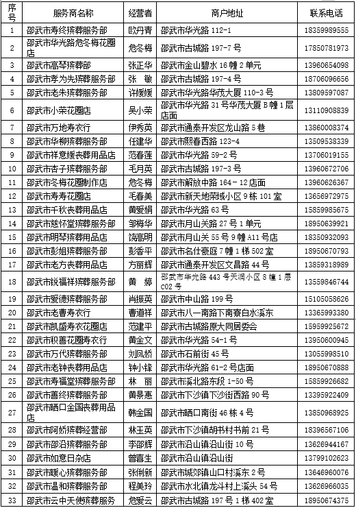 廣大市民群眾: 為進一步引導(dǎo)規(guī)范我市殯葬服務(wù)行業(yè)市場秩序,切實保障人民群眾合法權(quán)益,邵武市民政局與市場監(jiān)管局近期對依法辦理營業(yè)執(zhí)照的殯葬“一條龍”中介服務(wù)商進行了現(xiàn)場監(jiān)督檢查,結(jié)合事后回訪調(diào)查,進行了綜合評分。并按照分值高低進行公布排名,以供喪屬需要時自主選擇。現(xiàn)就有關(guān)情況說明如下: 一、本次現(xiàn)場檢查重點查看“一條龍”服務(wù)商是否落實“亮證經(jīng)營、價格備案、明碼標(biāo)價、雙聯(lián)清單、進出臺賬”等制度,并結(jié)合事后對喪屬的滿意度回訪調(diào)查情況匯總形成。 二、本次排名公示除在市殯儀館、各醫(yī)療機構(gòu)等張貼外,還將在“邵武融媒”“邵武民政”等微信公眾號發(fā)布,市民群眾可以在網(wǎng)上詳細搜索查閱到各服務(wù)商的殯葬服務(wù)項目及價格,進行充分比較后選擇。 三、本公布排名實行動態(tài)管理,每半年進行一次現(xiàn)場監(jiān)督檢查后,根據(jù)各服務(wù)商服務(wù)質(zhì)量情況,進行動態(tài)更新。 四、提醒廣大市民群眾如有殯葬“一條龍”服務(wù)需要,請注意核實服務(wù)機構(gòu)營業(yè)執(zhí)照、價格公示、服務(wù)質(zhì)量評價等。 五、歡迎社會各界對殯葬“一條龍”服務(wù)商進行監(jiān)督,如發(fā)現(xiàn)存在未亮證經(jīng)營、不明碼標(biāo)價、服務(wù)質(zhì)量差等,可舉報反映至:市殯儀館0599-6226607,市場監(jiān)管投訴:12315。 邵武市民政局 邵武市市場監(jiān)督管理局 2025年9月16日