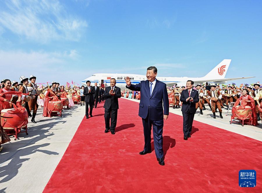 9月23日下午,中共中央總書記、國家主席、中央軍委主席習近平率中央代表團乘專機抵達烏魯木齊,出席新疆維吾爾自治區成立70周年慶?;顒印_@是習近平走出艙門,向歡迎群眾揮手致意。新華社記者 畢曉洋 攝 新華社烏魯木齊9月23日電 中共中央總書記、國家主席、中央軍委主席習近平率中央代表團23日下午乘專機抵達烏魯木齊,出席新疆維吾爾自治區成立70周年慶?;顒?。習近平作為中共中央總書記、國家主席、中央軍委主席率中央代表團到新疆出席新疆維吾爾自治區成立慶祝活動,在黨和國家歷史上是第一次,充分體現了黨中央對新疆工作的高度重視、對新疆各族干部群眾的親切關懷。 中共中央政治局常委、全國政協主席、中央代表團團長王滬寧,中共中央政治局常委、中央辦公廳主任蔡奇同機抵達。 金秋時節,新疆大地處處洋溢著豐收的喜悅。烏魯木齊天山國際機場鼓樂喧天,氣氛熱烈。