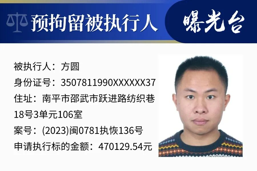 為切實保障勝訴當事人合法權益,維護司法權威,依照《中華人民共和國民事訴訟法》《最高人民法院關于民事執行中財產調查若干問題的規定》等有關規定,本院擬對有規避執行、拒不申報財產等行為的9名失信被執行人予以司法拘留。現根據《最高人民法院關于在執行中進一步強化善意文明執行理念的意見》,本院正告預拘留失信被執行人盡快履行生效法律文書所確定的義務,否則本院將采取司法拘留措施;構成犯罪的,將以拒不執行判決、裁定罪追究刑事責任。 特此公告。 聯系電話: 0599-6338523 0599-6322127 邵武市人民法院 2025年9月19日 本期預拘留名單如下: