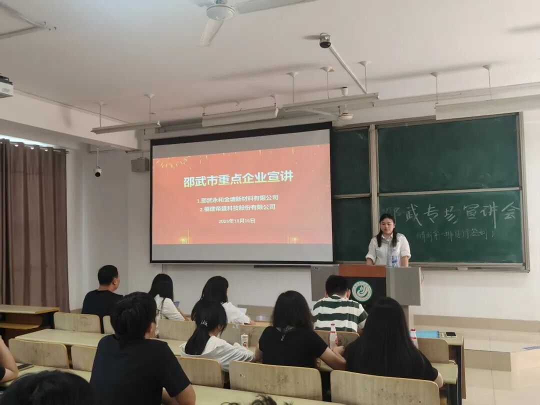 本網訊  為解決企業用工難題,10月15日至17日,邵武市人社局攜17家重點企業走進福建農林大學、閩江學院、武夷學院,成功舉辦2025年邵武市“才聚邵武,職等你來”重點企業校園行招聘活動,并同步開展就業人才政策宣講。為我市用人單位搭建招聘供需平臺,也為畢業生留邵發展搭建平臺。
