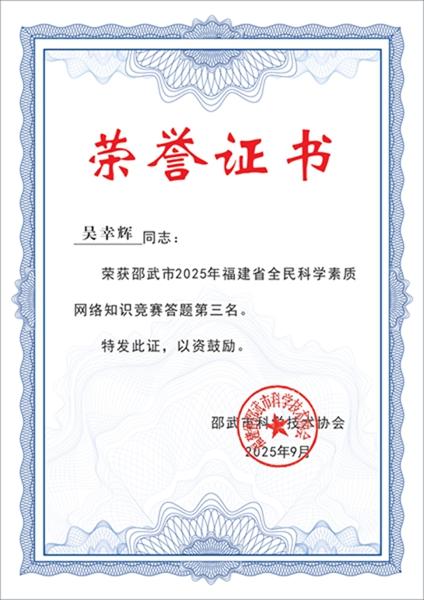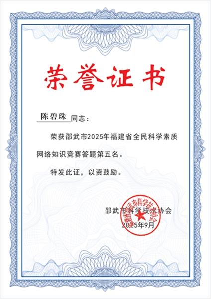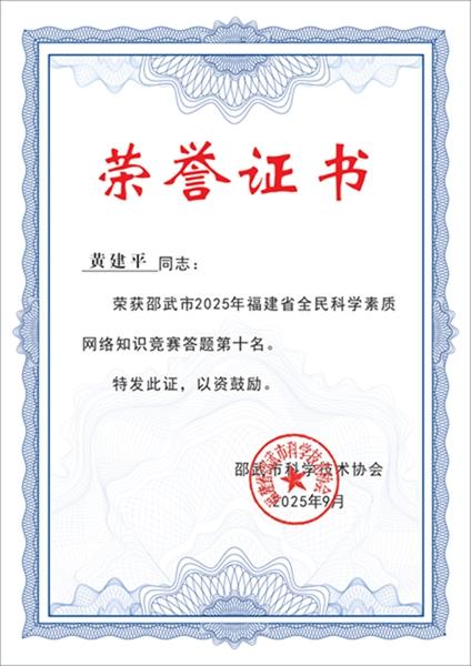 為深入貫徹習(xí)近平總書記關(guān)于科學(xué)普及和科學(xué)素質(zhì)建設(shè)工作的重要指示批示精神,落實(shí)《福建省“十四五”全民科學(xué)素質(zhì)行動(dòng)規(guī)劃綱要實(shí)施方案》,邵武市科協(xié)精心組織開展以“@邵武市2025年福建省全民科學(xué)素質(zhì)網(wǎng)絡(luò)競(jìng)賽火熱來襲!”為主題的網(wǎng)絡(luò)競(jìng)賽活動(dòng)。活動(dòng)期間,通過邵武融媒等官方公眾號(hào)全面發(fā)布競(jìng)賽規(guī)則、參賽指南、科普知識(shí)、參與方式及獎(jiǎng)勵(lì)機(jī)制,廣泛動(dòng)員市民參與。 本次競(jìng)賽歷時(shí)四個(gè)月,得到社會(huì)各界積極響應(yīng)與支持。為表彰先進(jìn)、激發(fā)全民學(xué)科學(xué)的熱情,根據(jù)競(jìng)賽規(guī)則評(píng)選出全市前100名優(yōu)秀參賽者,市科協(xié)將為其頒發(fā)榮譽(yù)證書及獎(jiǎng)品。現(xiàn)將競(jìng)賽前十名獲獎(jiǎng)人員予以公示展示: 1. 第一名: